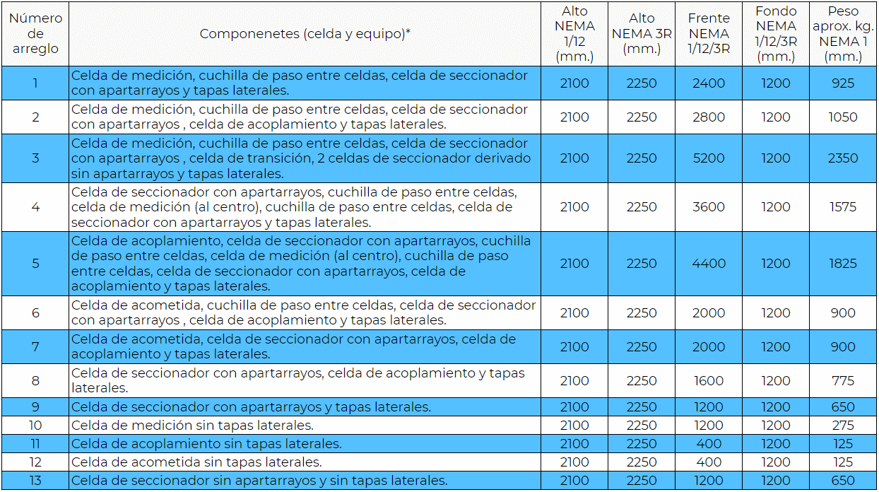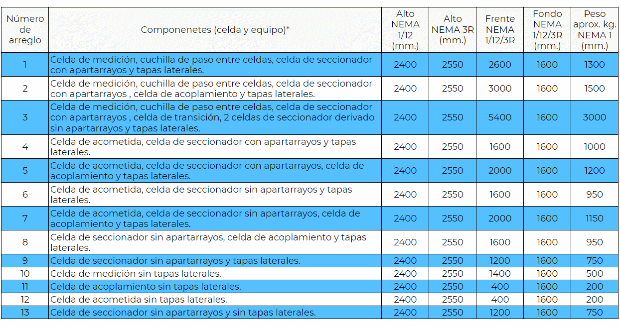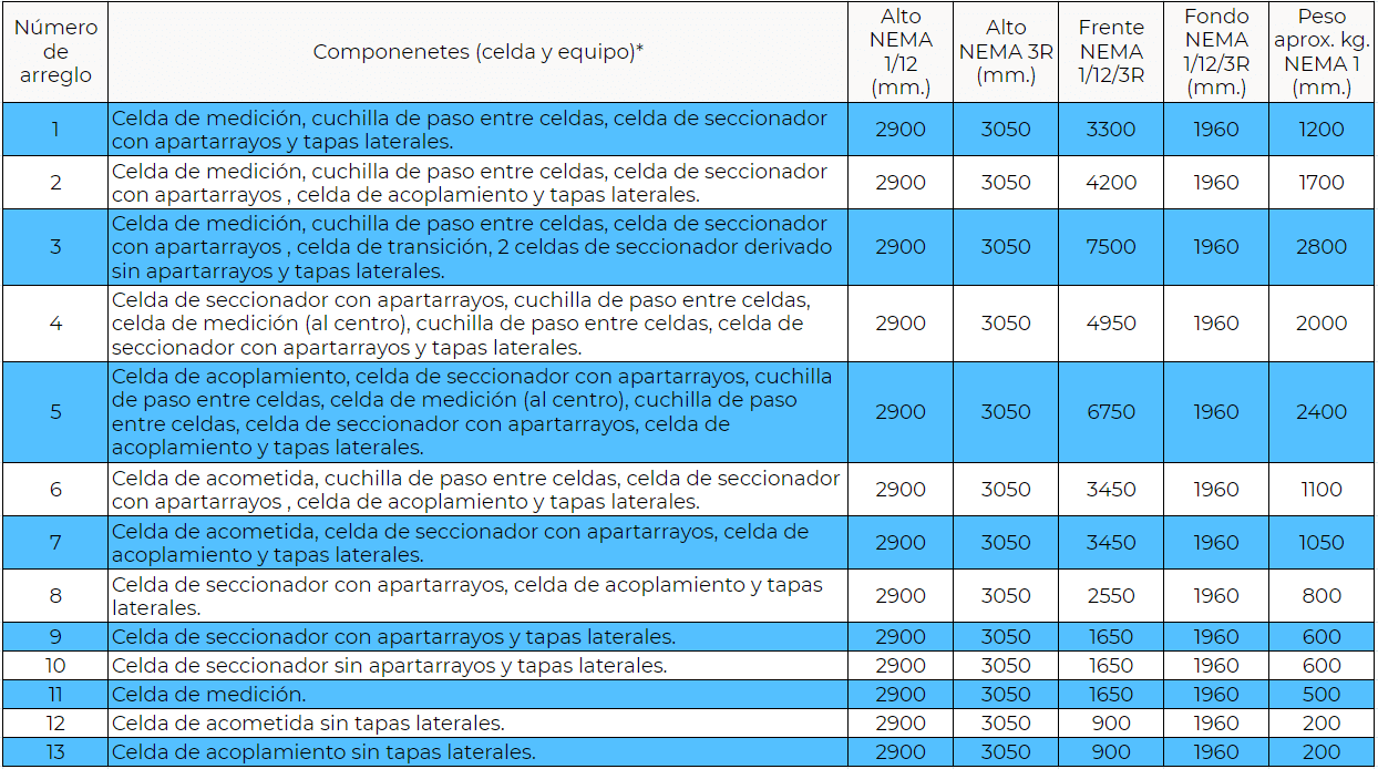 Todos los arreglos de subestaciones eléctricas están construidos con lámina de acero rolado en frío y terminados con pintura electrostática a base de polvo epóxico. Las estructuras y puertas están integradas con lámina calibre 12 (2,78 mm), y las cubiertas en calibre 12 (2.78 mm).